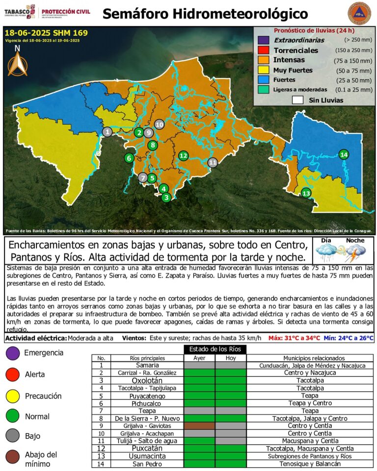 Sistemas de baja presión en conjunto a una alta entrada de humedad favorecerán lluvias intensas de 75 a 150 mm en las subregiones de Centro, Pantanos y Sierra, así como E. Zapata y Paraíso. Lluvias fuertes a muy fuertes de hasta 75 mm pueden presentarse en el resto del Estado.