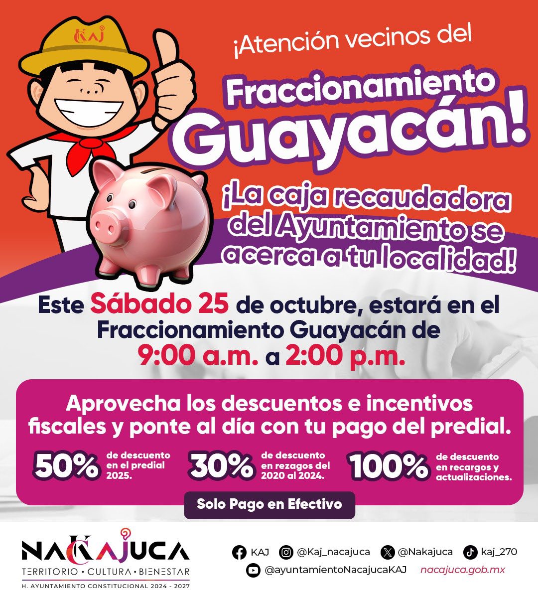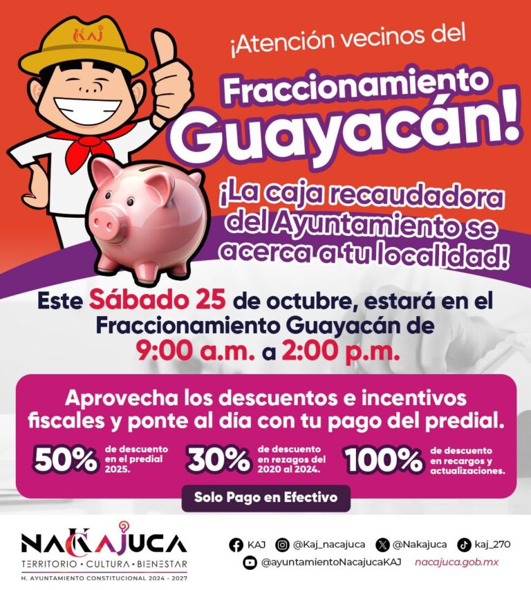 ¡ATENCIÓN VECINOS FRACCIONAMIENTOS: GUAYACÁN,LOS NARANJOS, LAS TERRAZAS! La caja recaudadora del Ayuntamiento se acerca a tu localidad