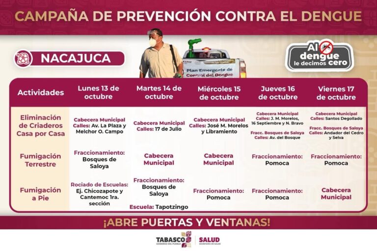 La Secretaría de Salud del Estado de Tabasco fortalece el operativo de fumigación y eliminación de criaderos de mosquitos con el objetivo de salvaguardar la salud de las y los tabasqueños del 13 al 17 de octubre.