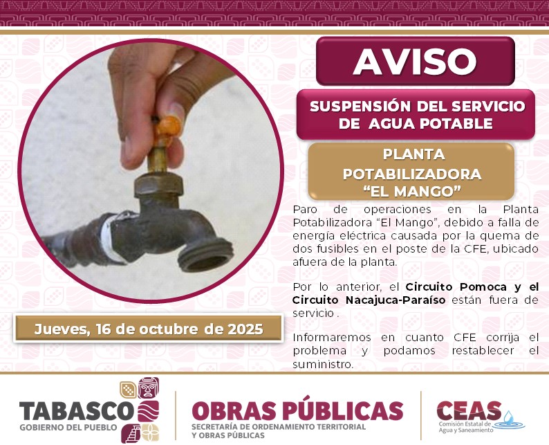 Suspensión del servicio de agua potable, jueves 16 de octubre