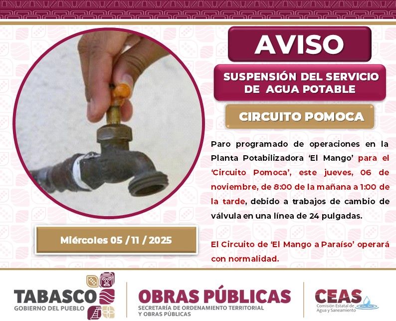 Suspensión del servicio de agua potable, circuito Pomoca, 06 de noviembre