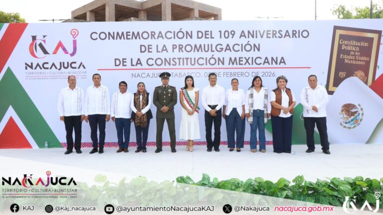 El presidente municipal de Nacajuca, Roberto Ocaña Leyva, encabezó el acto cívico conmemorativo del 109 aniversario de la promulgación de la Constitución Política de los Estados Unidos Mexicanos, realizado con la participación de autoridades municipales, educativas, representantes institucionales y contingentes escolares.
