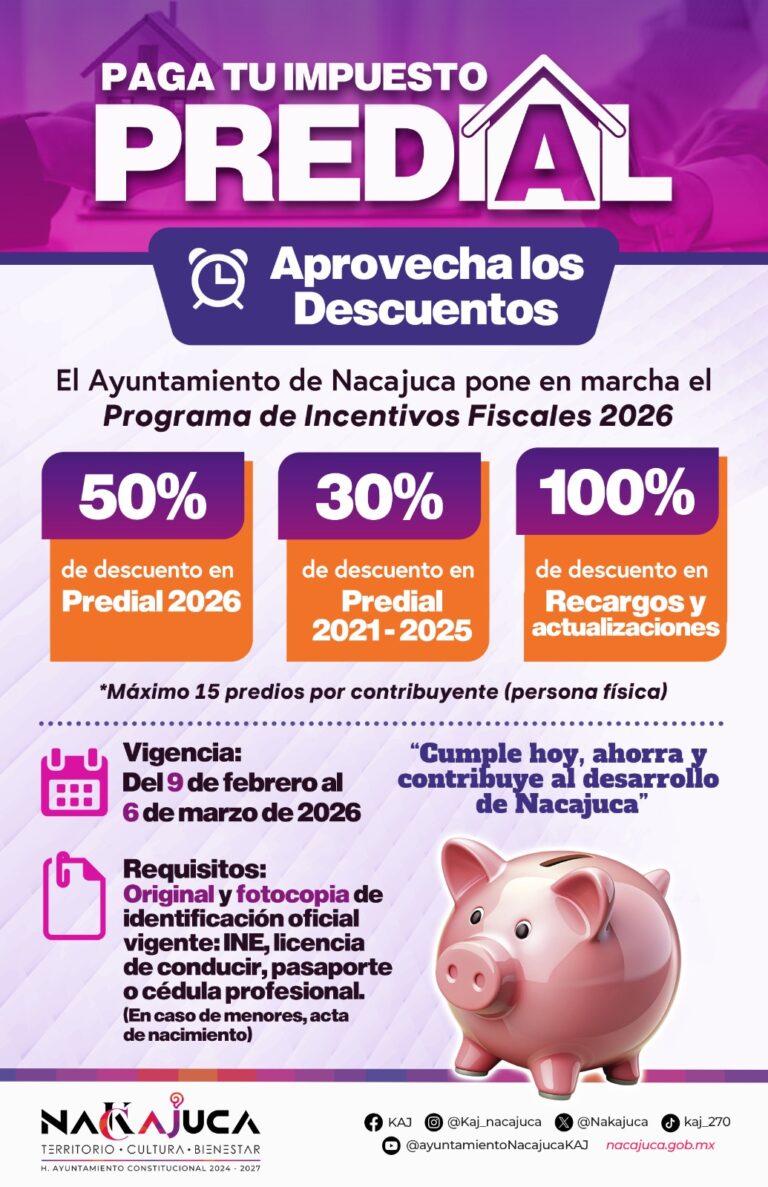 El Ayuntamiento de Nacajuca te invita a pagar tu impuesto predial y aprovechar los descuentos vigentes del Programa de Incentivos Fiscales 2026.