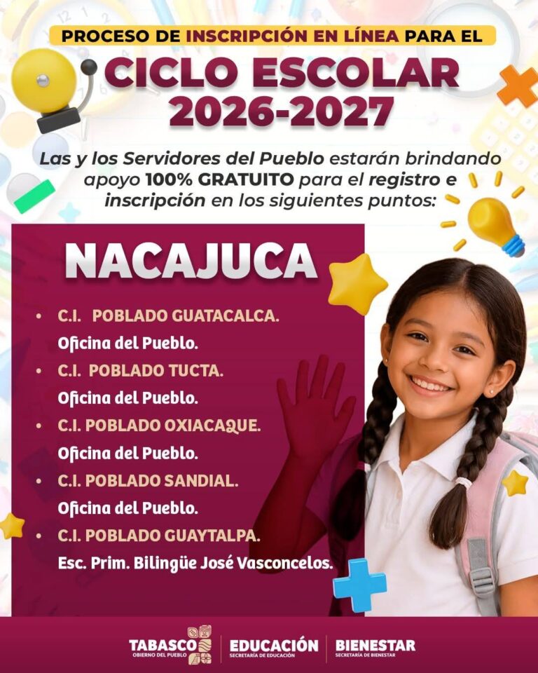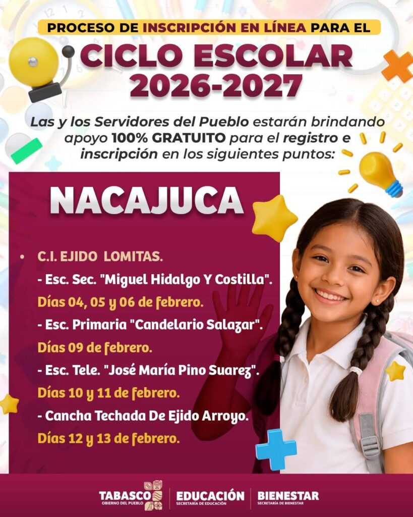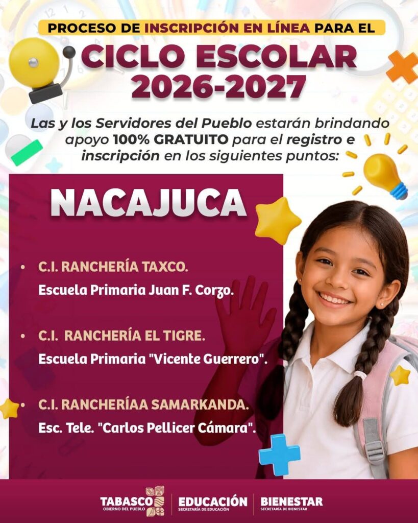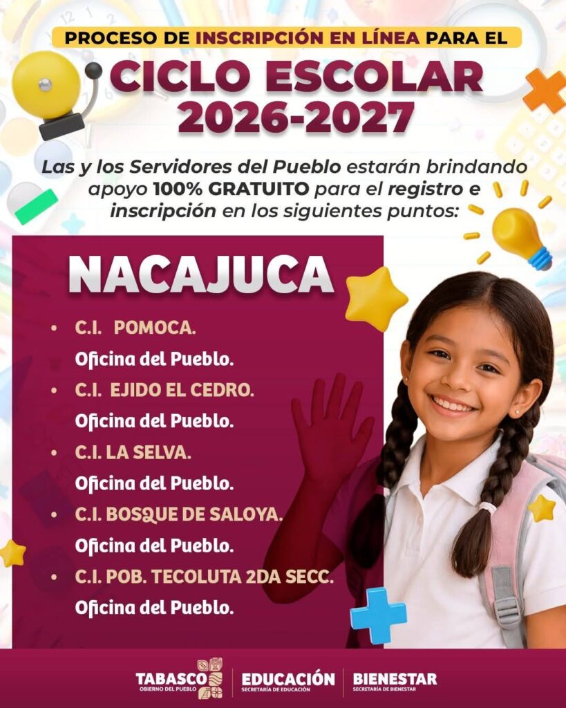 La Secretaría de Educación Tabasco informa que, a partir de este lunes, se brindará apoyo gratuito a madres, padres y tutores durante el proceso de inscripción en línea para el cicloescolar 2026–2027, a través de los Centros Integradores.