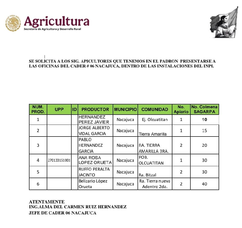 Se solicita a las y los productores que aparecen en la lista anexa, acudir a las oficinas del CADER #06 Nacajuca (instalaciones del INPI).