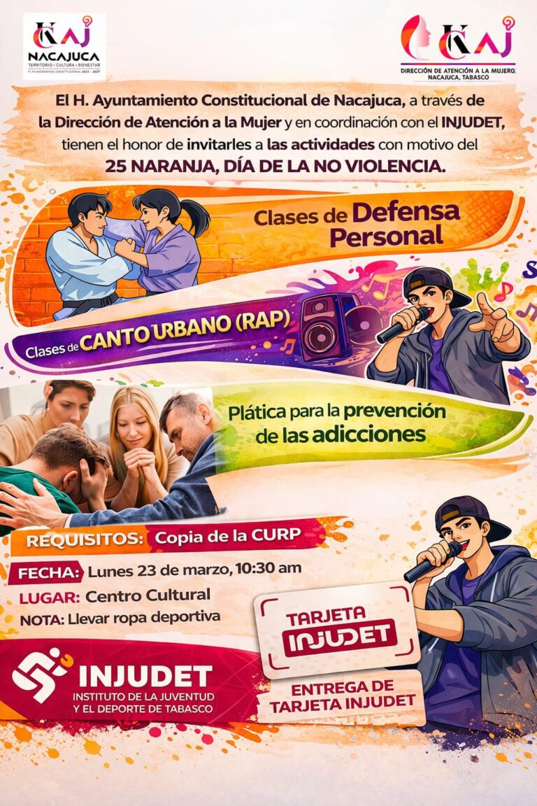 En el marco del 25 Naranja, Día de la No Violencia, te invitamos a participar en nuestras actividades: defensa personal, canto urbano (rap) y plática para la prevención de adicciones.