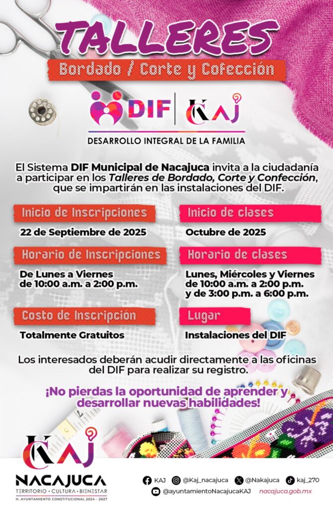 El DIF Municipal de Nacajuca te invita a inscribirte en los Talleres de Bordado, Corte y Confección. ¡Inscríbete y forma